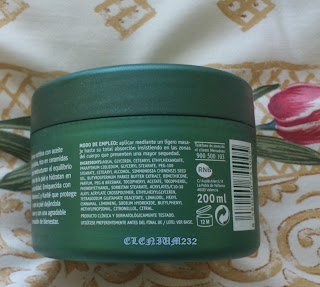 La textura a mi me resulta agradable. Se nos presenta como una crema corporal, yo diría que es ligera, no es tan pesada como una manteca corporal, que suele ser más pesada, y absorción más lenta. Esta se absorbe rápidamente, no deja sensación de humedad ( que a muchas molesta) y deja la piel con sensación fresca. También se nota que no es muy pesada en el bote, pues como la muevas o la vuelques sin querer esta crema en seguida se escurre.