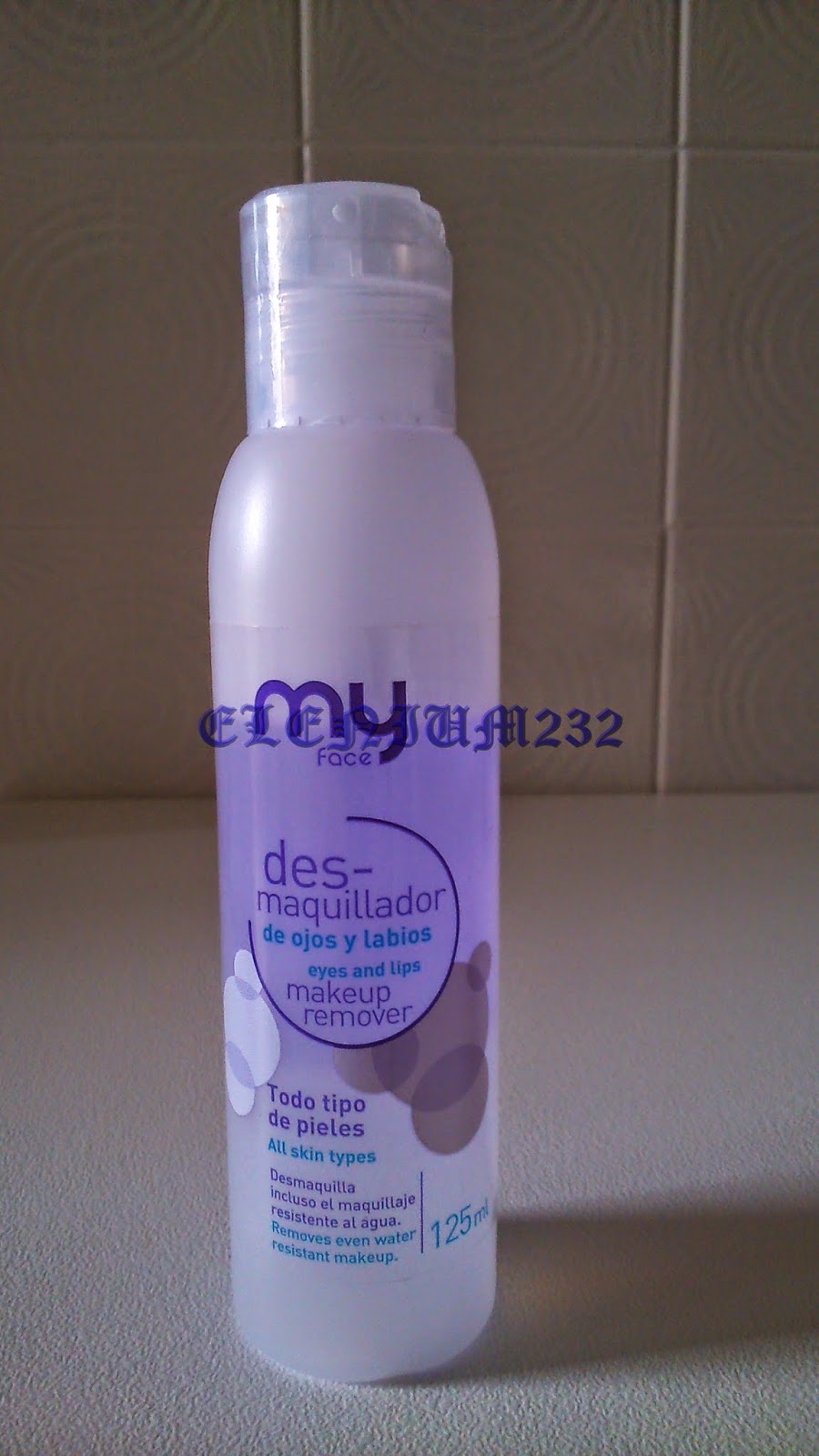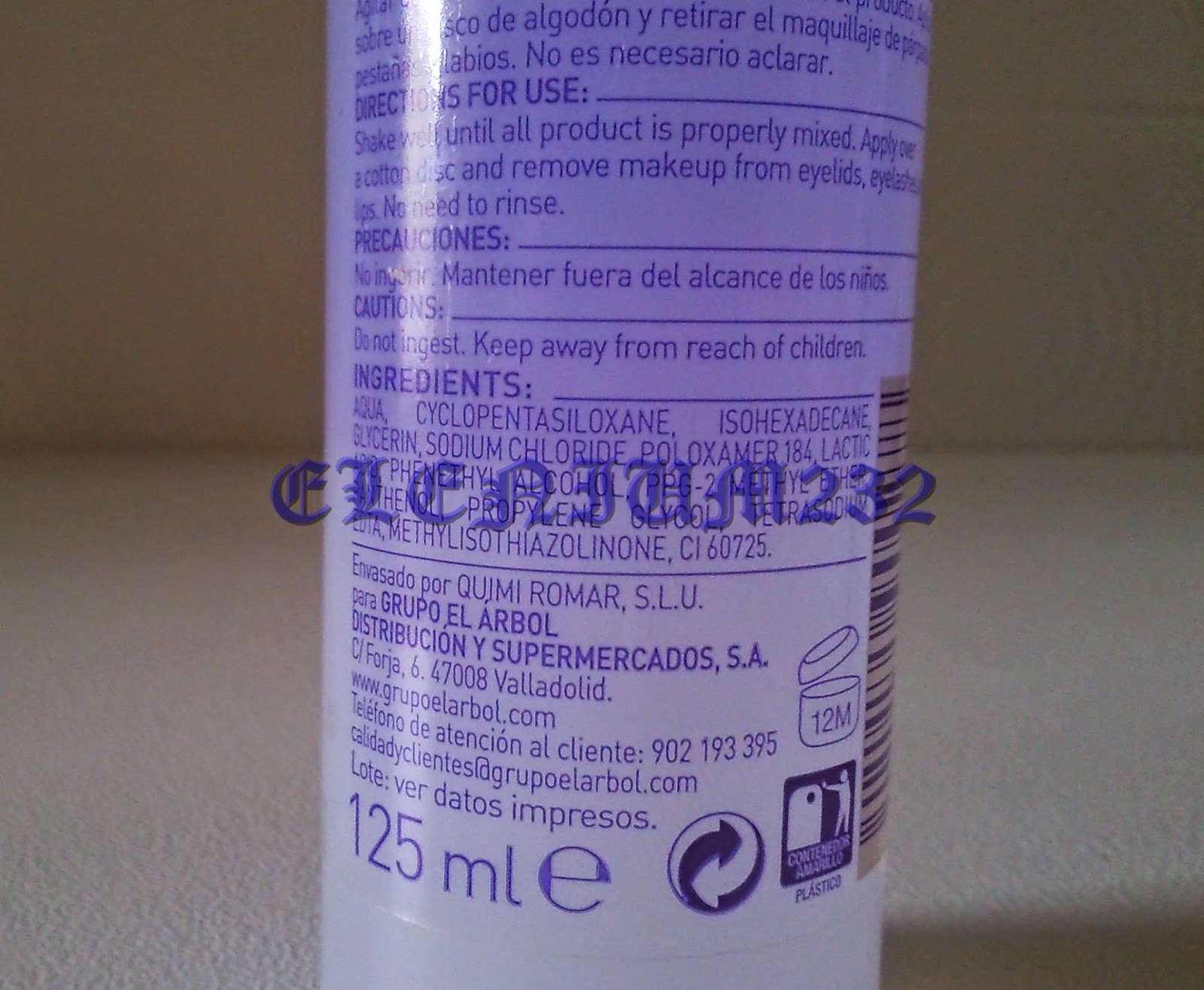 Estando en el Arbol ( para las que no sea de España, es una cadena de supermercados) me pare en la sección de cosmética , y me dio por mira sobre todo su línea blanca que se llama MY. Descubrí el desmaquillante bifásico, el bote me pareció pequeño, pero el formato me recordó al de Mercadona y el color también, es un tono morado. Cuesta 2, 15€ no me pareció caro y trae 125 ml. Mas o menos lo que traen otros.