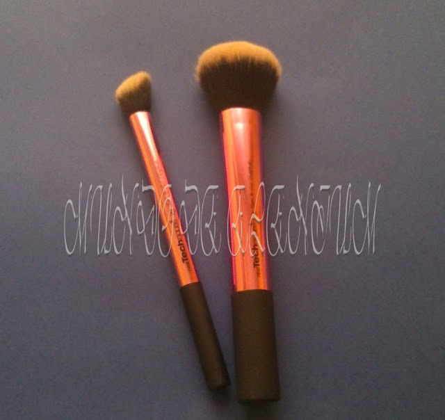 Brochas de Real Thechniques : concretamente dos de mis nuevas adquisiciones de famoso pack deluxe gift set, que es una edicion limitada. En concreto son la multi task brush y la exclusiva angled highlighter brush. La primera una todo terreno que vale desde para aplicar polvos sueltos a el bronceador, que para este último la utilizo yo. Y la segunda la estoy usando para aplicarme la base de maquillaje y el corrector.
