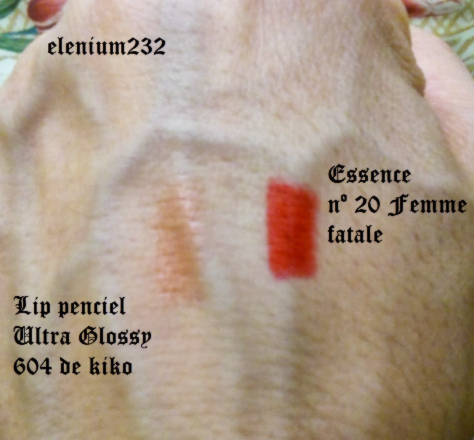 También compre un perfilador de labios Ultra glossy en el nº 604, huele muy bien. También compre un perfilador de labios en tono rojo de Essence 20 Femme Fatale.