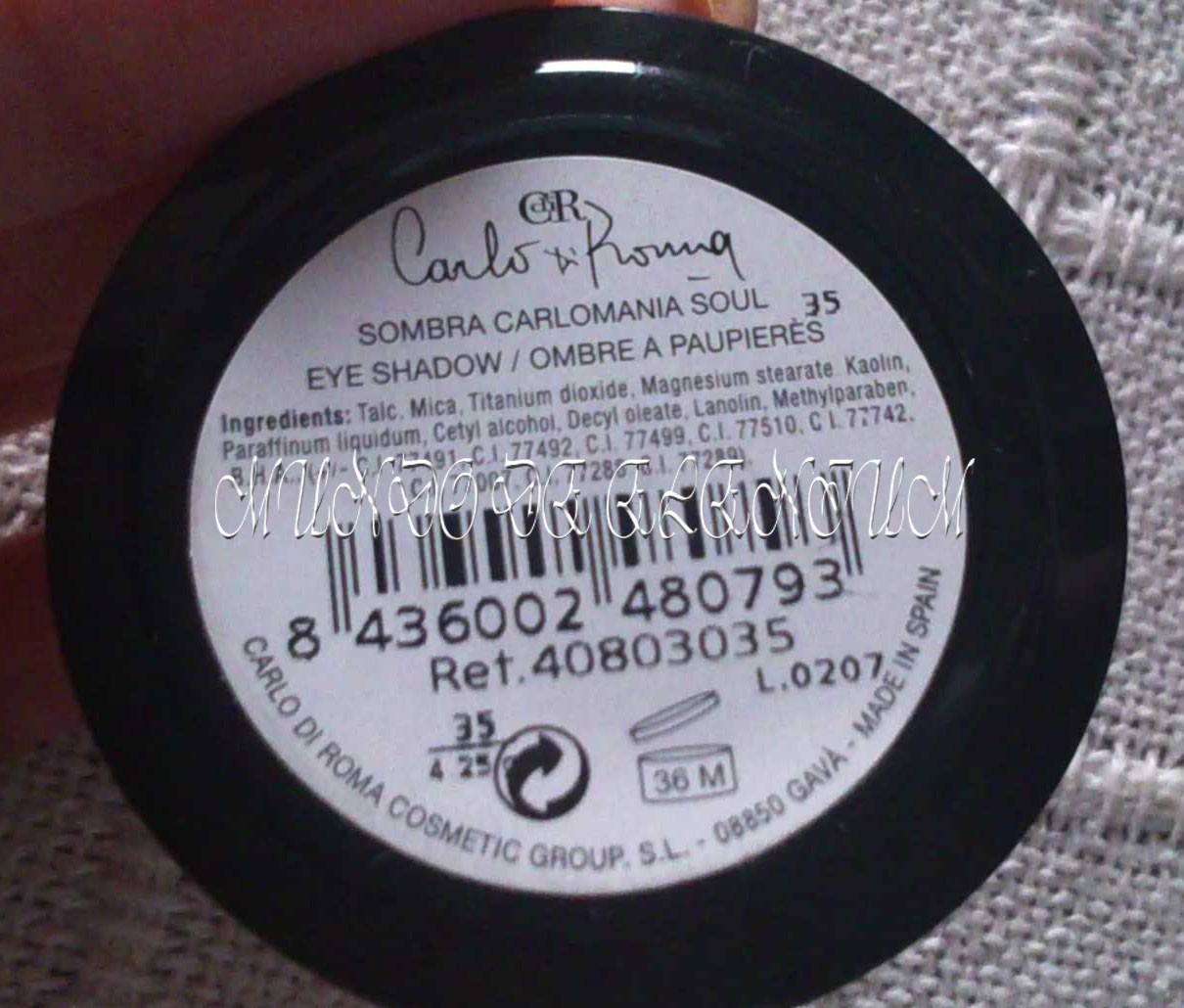 Una sombra de Carlo di Roma nº 35 que hacía mucho que no veía, y como tenía un evento importante y no sabía me tenía que maquillar allí o si podría salir desde casa ya arreglada, pensé que este sombre me valdría y si se rompía no me dolería tanto. Es azul con destellos azules, en el vídeo se ve perfectamente….. aquí se me olvido poneros foto……