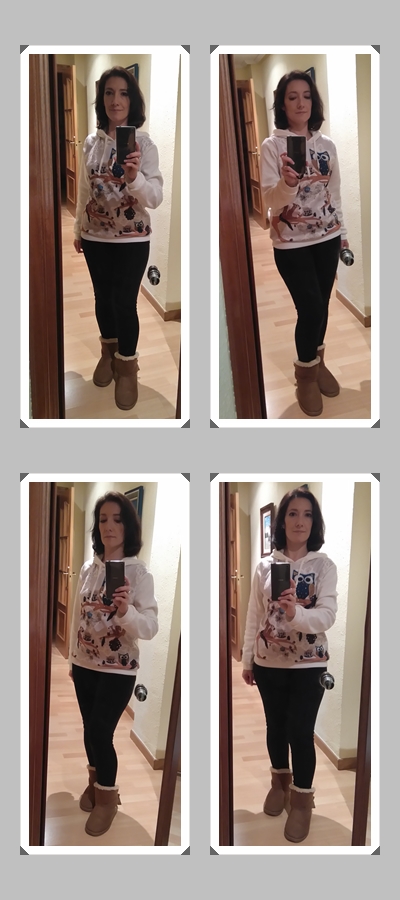 Pero para estos primeros días yo suelo recurrir a un look como este. Una sudadera bastante gordita o que por dentro este forradita con algo amoroso, y que tengo un dibujo divertido ( la mia tiene buhos y ya la habeis visto seguro) unos leggins polares, pero polares, es decir que sean bien gordito el relleno y para los pies una UGG, estas son de Blanco… una mochila y un plumas y lista para hacer las compras…..